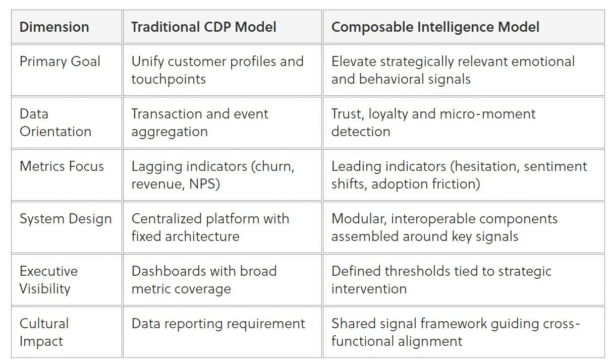Composable intelligence offers the flexibility to surface the right signals. Emotionally intelligent design ensures those signals reflect how customers actually feel and behave. Leadership discipline determines which ones shape action.